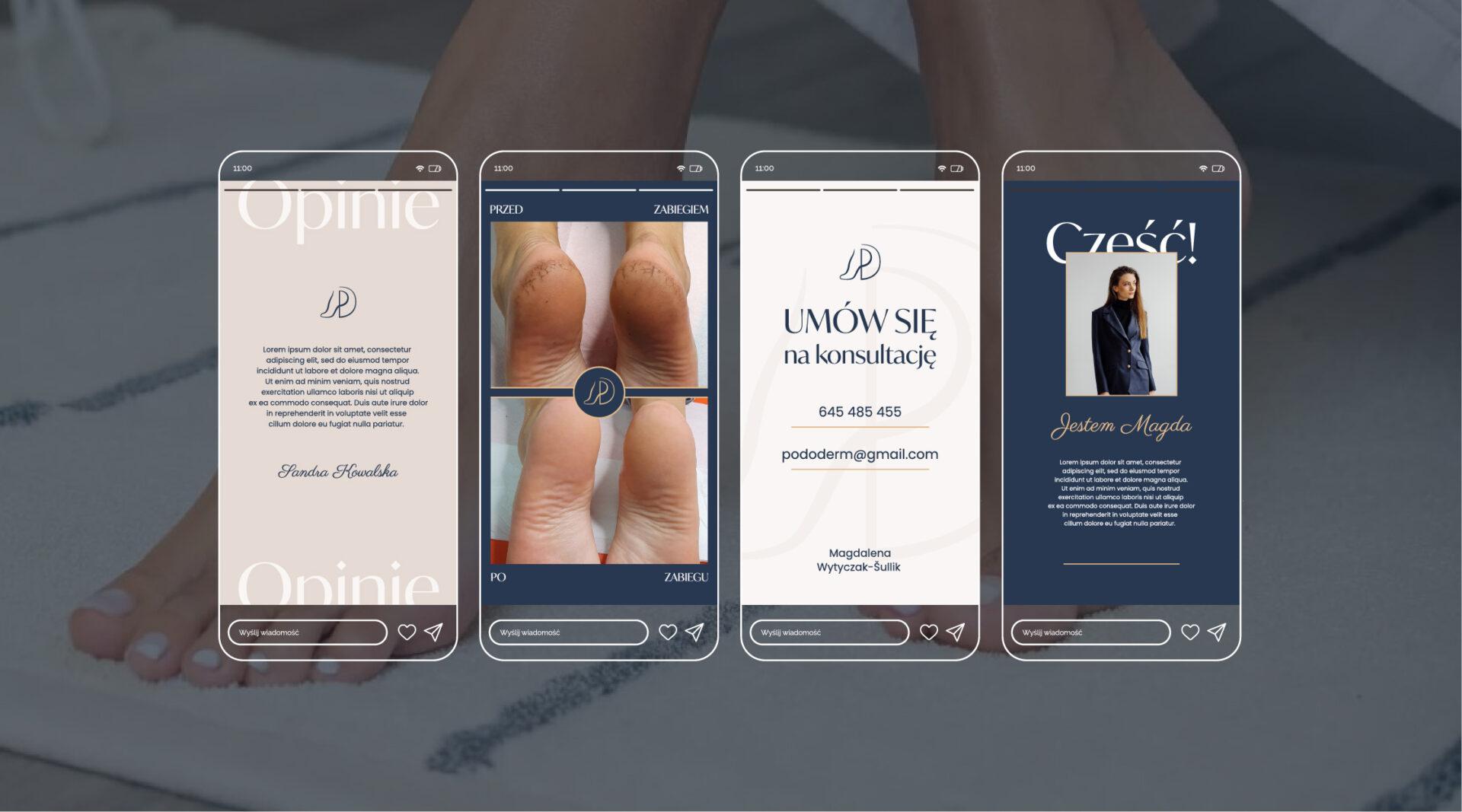 Celem było stworzenie wizerunku marki łączącej medyczny profesjonalizm z ciepłym, troskliwym podejściem do pacjenta, bez chłodnego, szpitalnego charakteru. Branding opiera się na eleganckiej palecie granatu, ciepłych bieli i beżu oraz subtelnych akcentów złota, co buduje poczucie zaufania, spokoju i wysokiej jakości usług. Kluczowym elementem jest logo, w którym inicjały P i D tworzą minimalistyczny zarys stopy, nadając marce unikalny i łatwo rozpoznawalny charakter. W ramach projektu powstała pełna identyfikacja wizualna, obejmująca logo, materiały drukowane oraz szablony do social media, zapewniając spójne i profesjonalne doświadczenie marki na każdym etapie kontaktu z klientem.
